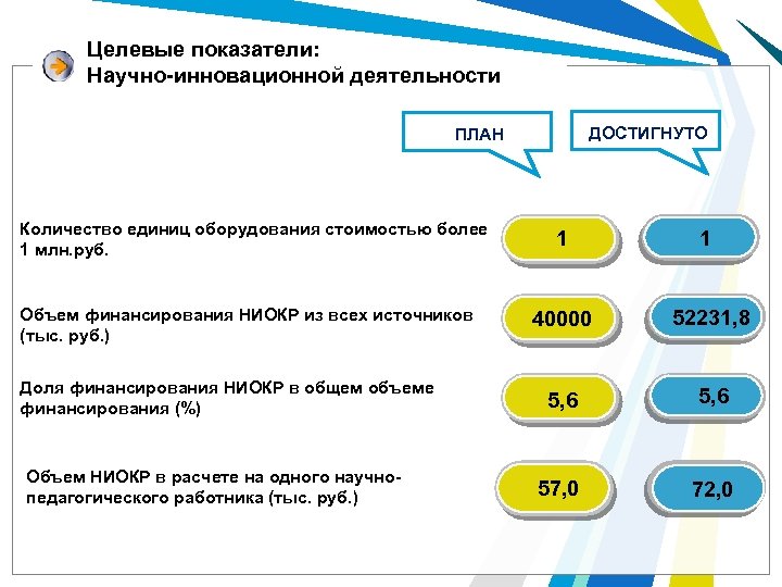 Целевые показатели: Научно-инновационной деятельности ДОСТИГНУТО ПЛАН Количество единиц оборудования стоимостью более 1 млн. руб. Объем финансирования НИОКР из всех источников (тыс. руб. ) Доля финансирования НИОКР в общем объеме финансирования (%) Объем НИОКР в расчете на одного научнопедагогического работника (тыс. руб. ) 1 1 40000 52231, 8 5, 6 57, 0 72, 0