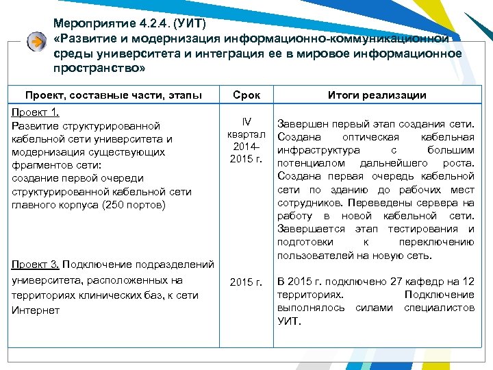 Мероприятие 4. 2. 4. (УИТ) «Развитие и модернизация информационно-коммуникационной среды университета и интеграция ее в мировое информационное пространство» Проект, составные части, этапы Проект 1. Развитие структурированной кабельной сети университета и модернизация существующих фрагментов сети: создание первой очереди структурированной кабельной сети главного корпуса (250 портов) Проект 3. Подключение подразделений университета, расположенных на территориях клинических баз, к сети Интернет Срок Итоги реализации IV квартал 20142015 г. Завершен первый этап создания сети. Создана оптическая кабельная инфраструктура с большим потенциалом дальнейшего роста. Создана первая очередь кабельной сети по зданию до рабочих мест сотрудников. Переведены сервера на работу в новой кабельной сети. Завершается этап тестирования и подготовки к переключению пользователей на новую сеть. 2015 г. В 2015 г. подключено 27 кафедр на 12 территориях. Подключение выполнялось силами специалистов УИТ.