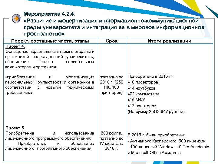 Мероприятие 4. 2. 4. «Развитие и модернизация информационно-коммуникационной среды университета и интеграция ее в мировое информационное пространство» Проект, составные части, этапы Проект 4. Оснащение персональными компьютерами и оргтехникой подразделений университета, обновление парка персональных компьютеров и оргтехники: Срок Итоги реализации -приобретение и модернизация поэтапно до Приобретено в 2015 г. : персональных компьютеров и оргтехники в 2018 г. (250 10 проекторов соответствии с новыми техническими ПК, 100 14 ноутбуков требованиями принтеров) 72 компьютера 16 МФУ 17 принтеров (На сумму 2 813 947 рублей) Проект 5. Приобретение и использование 800 компл. В 2015 г. были приобретены: лицензионного программного обеспечения: поэтапно до - Антивирус Касперского, 500 лицензий - Приобретение и обновление IV квартала - 100 лицензий Windows 10 Pro Academic лицензионного программного обеспечения 2018 г. и Microsoft Office Academic