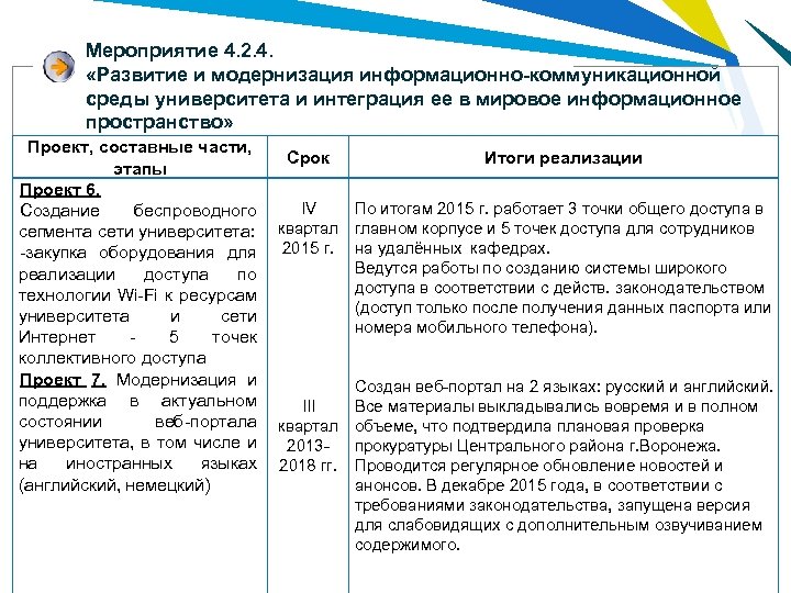 Мероприятие 4. 2. 4. «Развитие и модернизация информационно-коммуникационной среды университета и интеграция ее в мировое информационное пространство» Проект, составные части, Срок Итоги реализации этапы Проект 6. IV По итогам 2015 г. работает 3 точки общего доступа в Создание беспроводного сегмента сети университета: квартал главном корпусе и 5 точек доступа для сотрудников -закупка оборудования для 2015 г. на удалённых кафедрах. Ведутся работы по созданию системы широкого реализации доступа по доступа в соответствии с действ. законодательством технологии Wi-Fi к ресурсам (доступ только после получения данных паспорта или университета и сети номера мобильного телефона). Интернет - 5 точек коллективного доступа Проект 7. Модернизация и Создан веб-портал на 2 языках: русский и английский. поддержка в актуальном III Все материалы выкладывались вовремя и в полном состоянии веб-портала квартал объеме, что подтвердила плановая проверка университета, в том числе и 2013 - прокуратуры Центрального района г. Воронежа. на иностранных языках 2018 гг. Проводится регулярное обновление новостей и (английский, немецкий) анонсов. В декабре 2015 года, в соответствии с требованиями законодательства, запущена версия для слабовидящих с дополнительным озвучиванием содержимого.