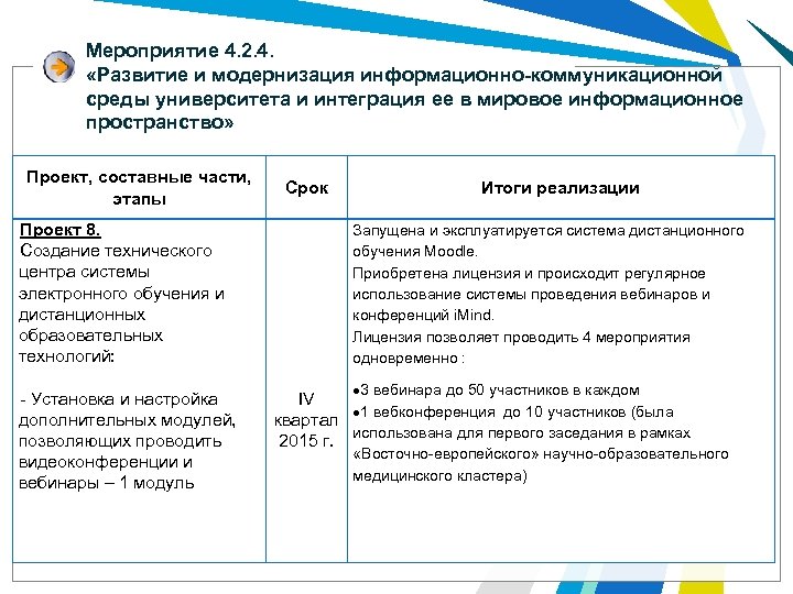 Мероприятие 4. 2. 4. «Развитие и модернизация информационно-коммуникационной среды университета и интеграция ее в мировое информационное пространство» Проект, составные части, этапы Проект 8. Создание технического центра системы электронного обучения и дистанционных образовательных технологий: - Установка и настройка дополнительных модулей, позволяющих проводить видеоконференции и вебинары – 1 модуль Срок Итоги реализации Запущена и эксплуатируется система дистанционного обучения Moodle. Приобретена лицензия и происходит регулярное использование системы проведения вебинаров и конференций i. Mind. Лицензия позволяет проводить 4 мероприятия одновременно : 3 вебинара до 50 участников в каждом IV 1 вебконференция до 10 участников (была квартал использована для первого заседания в рамках 2015 г. «Восточно-европейского» научно-образовательного медицинского кластера)