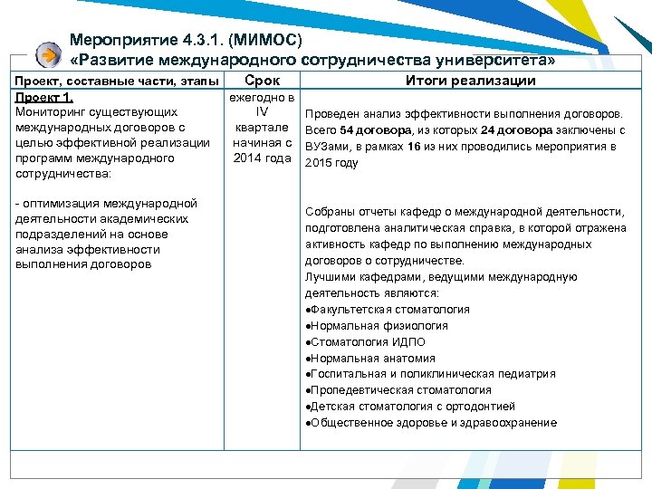 Мероприятие 4. 3. 1. (МИМОС) «Развитие международного сотрудничества университета» Проект, составные части, этапы Срок Итоги реализации Проект 1. ежегодно в Мониторинг существующих IV Проведен анализ эффективности выполнения договоров. международных договоров с квартале Всего 54 договора, из которых 24 договора заключены с целью эффективной реализации начиная с ВУЗами, в рамках 16 из них проводились мероприятия в программ международного 2014 года 2015 году сотрудничества: - оптимизация международной деятельности академических подразделений на основе анализа эффективности выполнения договоров Собраны отчеты кафедр о международной деятельности, подготовлена аналитическая справка, в которой отражена активность кафедр по выполнению международных договоров о сотрудничестве. Лучшими кафедрами, ведущими международную деятельность являются: Факультетская стоматология Нормальная физиология Стоматология ИДПО Нормальная анатомия Госпитальная и поликлиническая педиатрия Пропедевтическая стоматология Детская стоматология с ортодонтией Общественное здоровье и здравоохранение