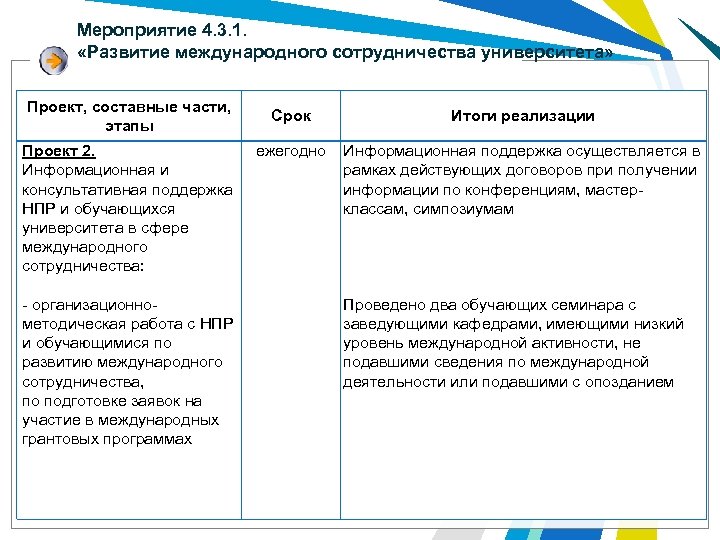 Мероприятие 4. 3. 1. «Развитие международного сотрудничества университета» Проект, составные части, этапы Проект 2. Информационная и консультативная поддержка НПР и обучающихся университета в сфере международного сотрудничества: - организационнометодическая работа с НПР и обучающимися по развитию международного сотрудничества, по подготовке заявок на участие в международных грантовых программах Срок Итоги реализации ежегодно Информационная поддержка осуществляется в рамках действующих договоров при получении информации по конференциям, мастерклассам, симпозиумам Проведено два обучающих семинара с заведующими кафедрами, имеющими низкий уровень международной активности, не подавшими сведения по международной деятельности или подавшими с опозданием
