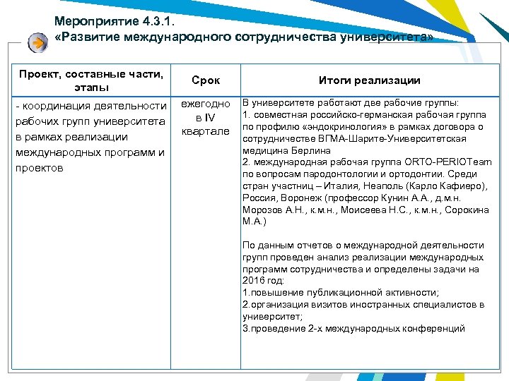 Мероприятие 4. 3. 1. «Развитие международного сотрудничества университета» Проект, составные части, этапы Срок - координация деятельности ежегодно в IV рабочих групп университета квартале в рамках реализации международных программ и проектов Итоги реализации В университете работают две рабочие группы: 1. совместная российско-германская рабочая группа по профилю «эндокринология» в рамках договора о сотрудничестве ВГМА-Шарите-Университетская медицина Берлина 2. международная рабочая группа ORTO-PERIOTeam по вопросам пародонтологии и ортодонтии. Среди стран участниц – Италия, Неаполь (Карло Кафиеро), Россия, Воронеж (профессор Кунин А. А. , д. м. н. Морозов А. Н. , к. м. н. , Моисеева Н. С. , к. м. н. , Сорокина М. А. ) По данным отчетов о международной деятельности групп проведен анализ реализации международных программ сотрудничества и определены задачи на 2016 год: 1. повышение публикационной активности; 2. организация визитов иностранных специалистов в университет; 3. проведение 2 -х международных конференций