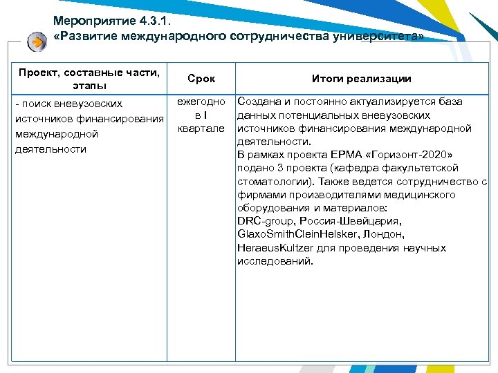 Мероприятие 4. 3. 1. «Развитие международного сотрудничества университета» Проект, составные части, этапы Срок ежегодно - поиск вневузовских в I источников финансирования квартале международной деятельности Итоги реализации Создана и постоянно актуализируется база данных потенциальных вневузовских источников финансирования международной деятельности. В рамках проекта ЕРМА «Горизонт-2020» подано 3 проекта (кафедра факультетской стоматологии). Также ведется сотрудничество с фирмами производителями медицинского оборудования и материалов: DRC-group, Россия-Швейцария, Glaxo. Smith. Clein. Helsker, Лондон, Heraeus. Kultzer для проведения научных исследований.