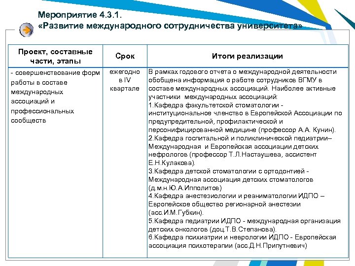 Мероприятие 4. 3. 1. «Развитие международного сотрудничества университета» Проект, составные части, этапы - совершенствование форм работы в составе международных ассоциаций и профессиональных сообществ Срок Итоги реализации ежегодно в IV квартале В рамках годового отчета о международной деятельности обобщена информация о работе сотрудников ВГМУ в составе международных ассоциаций. Наиболее активные участники международных ассоциаций: 1. Кафедра факультетской стоматологии - институциональное членство в Европейской Ассоциации по предупредительной, профилактической и персонифицированной медицине (профессор А. А. Кунин). 2. Кафедра госпитальной и поликлинической педиатрии– Международная и Европейская ассоциации детских нефрологов (профессор Т. Л. Настаушева, ассистент Е. Н. Кулакова). 3. Кафедра детской стоматологии с ортодонтией - Международная ассоциация детских стоматологов (д. м. н. Ю. А. Ипполитов) 4. Кафедра анестезиологии и реаниматологии ИДПО – Европейское общество регионарной анестезии (асс. И. М. Губкин). 5. Кафедра педиатрии ИДПО - международная организация детских онкологов (доц. Т. В. Степанова). 6. Кафедра психиатрии и неврологии ИДПО - Европейская ассоциация психотерапии (асс. Д. Н. Припутневич)