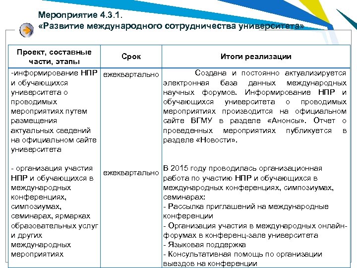 Мероприятие 4. 3. 1. «Развитие международного сотрудничества университета» Проект, составные Срок Итоги реализации части, этапы -информирование НПР ежеквартально Создана и постоянно актуализируется и обучающихся электронная база данных международных университета о научных форумов. Информирование НПР и проводимых обучающихся университета о проводимых мероприятиях путем мероприятиях производится на официальном размещения сайте ВГМУ в разделе «Анонсы» . Отчет о актуальных сведений проведенных мероприятиях публикуется в на официальном сайте разделе «Новости» . университета - организация участия В 2015 году проводилась организационная ежеквартально НПР и обучающихся в работа по участию НПР и обучающихся в международных конференциях, симпозиумах, конференциях, семинарах: симпозиумах, - Рассылка приглашений на международные семинарах, ярмарках конференции образовательных услуг - Организация участия в международных онлайни других форумах в конференц-зале университета международных - Языковая поддержка мероприятиях - Консультативная помощь по организации выездов на конференции
