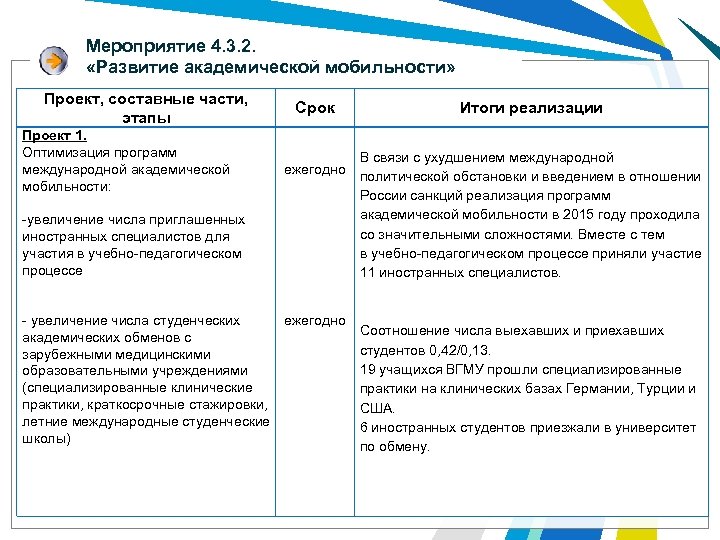 Мероприятие 4. 3. 2. «Развитие академической мобильности» Проект, составные части, этапы Проект 1. Оптимизация программ международной академической мобильности: -увеличение числа приглашенных иностранных специалистов для участия в учебно-педагогическом процессе Срок ежегодно Итоги реализации В связи с ухудшением международной политической обстановки и введением в отношении России санкций реализация программ академической мобильности в 2015 году проходила со значительными сложностями. Вместе с тем в учебно-педагогическом процессе приняли участие 11 иностранных специалистов. - увеличение числа студенческих ежегодно Соотношение числа выехавших и приехавших академических обменов с студентов 0, 42/0, 13. зарубежными медицинскими 19 учащихся ВГМУ прошли специализированные образовательными учреждениями (специализированные клинические практики на клинических базах Германии, Турции и практики, краткосрочные стажировки, США. летние международные студенческие 6 иностранных студентов приезжали в университет школы) по обмену.