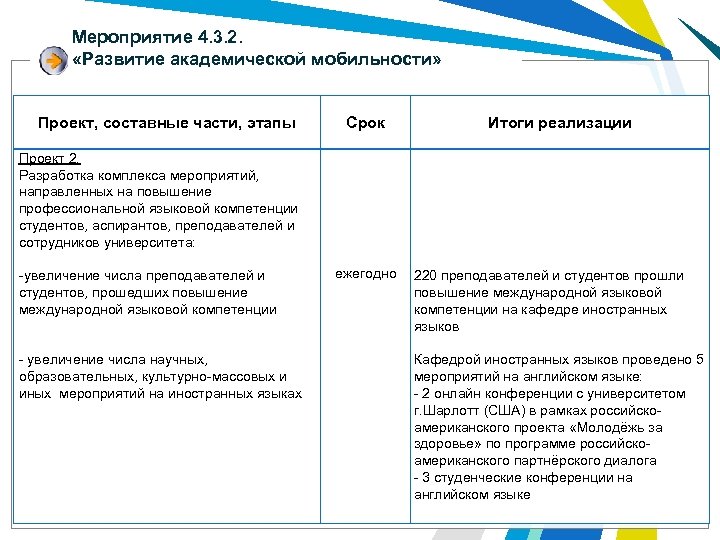 Мероприятие 4. 3. 2. «Развитие академической мобильности» Проект, составные части, этапы Проект 2. Разработка комплекса мероприятий, направленных на повышение профессиональной языковой компетенции студентов, аспирантов, преподавателей и сотрудников университета: -увеличение числа преподавателей и студентов, прошедших повышение международной языковой компетенции - увеличение числа научных, образовательных, культурно-массовых и иных мероприятий на иностранных языках Срок Итоги реализации ежегодно 220 преподавателей и студентов прошли повышение международной языковой компетенции на кафедре иностранных языков Кафедрой иностранных языков проведено 5 мероприятий на английском языке: - 2 онлайн конференции с университетом г. Шарлотт (США) в рамках российскоамериканского проекта «Молодёжь за здоровье» по программе российскоамериканского партнёрского диалога - 3 студенческие конференции на английском языке