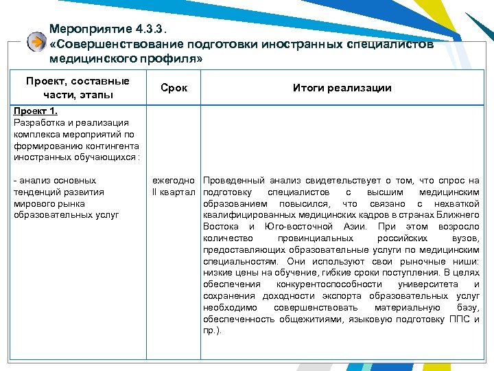 Мероприятие 4. 3. 3. «Совершенствование подготовки иностранных специалистов медицинского профиля» Проект, составные части, этапы Проект 1. Разработка и реализация комплекса мероприятий по формированию контингента иностранных обучающихся : - анализ основных тенденций развития мирового рынка образовательных услуг Срок Итоги реализации ежегодно Проведенный анализ свидетельствует о том, что спрос на II квартал подготовку специалистов с высшим медицинским образованием повысился, что связано с нехваткой квалифицированных медицинских кадров в странах Ближнего Востока и Юго-восточной Азии. При этом возросло количество провинциальных российских вузов, предоставляющих образовательные услуги по медицинским специальностям. Они используют свои рыночные ниши: низкие цены на обучение, гибкие сроки поступления. В целях обеспечения конкурентоспособности университета и сохранения доходности экспорта образовательных услуг необходимо совершенствовать материальную базу, обеспеченность общежитиями, языковую подготовку ППС и пр. ).