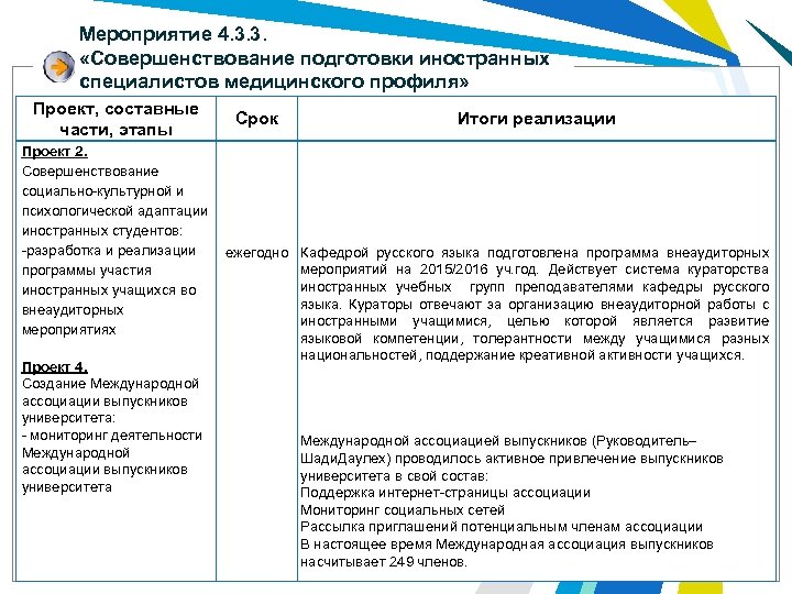 Мероприятие 4. 3. 3. «Совершенствование подготовки иностранных специалистов медицинского профиля» Проект, составные части, этапы Срок Итоги реализации Проект 2. Совершенствование социально-культурной и психологической адаптации иностранных студентов: -разработка и реализации ежегодно Кафедрой русского языка подготовлена программа внеаудиторных мероприятий на 2015/2016 уч. год. Действует система кураторства программы участия иностранных учебных групп преподавателями кафедры русского иностранных учащихся во языка. Кураторы отвечают за организацию внеаудиторной работы с внеаудиторных иностранными учащимися, целью которой является развитие мероприятиях языковой компетенции, толерантности между учащимися разных национальностей, поддержание креативной активности учащихся. Проект 4. Создание Международной ассоциации выпускников университета: - мониторинг деятельности Международной ассоциацией выпускников (Руководитель– Международной Шади. Даулех) проводилось активное привлечение выпускников ассоциации выпускников университета в свой состав: университета Поддержка интернет-страницы ассоциации Мониторинг социальных сетей Рассылка приглашений потенциальным членам ассоциации В настоящее время Международная ассоциация выпускников насчитывает 249 членов.