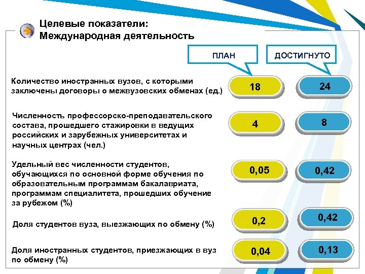 Целевые показатели: Международная деятельность ДОСТИГНУТО ПЛАН Количество иностранных вузов, с которыми заключены договоры о межвузовских обменах (ед. ) Численность профессорско-преподавательского состава, прошедшего стажировки в ведущих российских и зарубежных университетах и научных центрах (чел. ) Удельный вес численности студентов, обучающихся по основной форме обучения по образовательным программам бакалавриата, программам специалитета, прошедших обучение за рубежом (%) 18 24 4 8 0, 05 0, 42 Доля студентов вуза, выезжающих по обмену (%) 0, 2 0, 42 Доля иностранных студентов, приезжающих в вуз по обмену (%) 0, 04 0, 13
