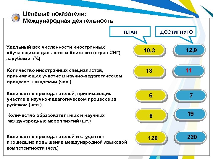 Целевые показатели: Международная деятельность ДОСТИГНУТО ПЛАН Удельный вес численности иностранных обучающихся дальнего и ближнего (стран СНГ) зарубежья (%) 10, 3 12, 9 18 11 Количество преподавателей, принимающих участие в научно-педагогическом процессе за рубежом (чел. ) 6 7 Количество образовательных и научных международных мероприятий (шт. ) 8 19 Количество преподавателей и студентов, прошедших повышение международной языковой компетентности (чел. ) 120 220 Количество иностранных специалистов, принимающих участие в научно-педагогическом процессе в академии (чел. )