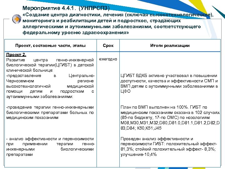 Мероприятие 4. 4. 1. (УНПРСПЗ) «Создание центра диагностики, лечения (включая высокотехнологическое), мониторинга и реабилитации детей и подростков, страдающих аллергическими и аутоиммунными заболеваниями, соответствующего федеральному уровню здравоохранения» Проект, составные части, этапы Срок Итоги реализации Проект 2. Развитие центра генно-инженерной ежегодно биологической терапии(ЦГИБТ) в детской клинической больнице: -предоставление в Центрально. ЦГИБТ ВДКБ активно участвовал в повышении Черноземном регионе доступности, качества и эффективности СМП и высокотехнологичной медицинской ВМП детям с аутоиммунными заболеваниями в помощи детям и подросткам с ЦФО аутоиммунными заболеваниями: -проведение терапии генно-инженерными План по ВМП выполнен на 100%. ГИБТ по биологическими препаратами больных по медицинским показаниям оказана в 102 случаях медицинским показаниям (85 -по бюджету, 17 -по ОМС) по нозологиям: М 08, М 30, М 31, М 32; D 80, D 81. 1, D 81. 2, D 83, D 84; К 50, К 51; J 45 - анализ эффективности и переносимости применении терапии генноинженерными биологическими препаратами Проведен анализ эффективности и переносимости ГИБТ: положительный эффект81, 3%; стойкий положительный эффект- 8, 3%; улучшение-10, 4%