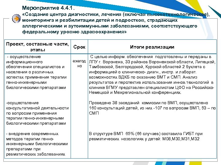 Мероприятие 4. 4. 1. «Создание центра диагностики, лечения (включая высокотехнологическое), мониторинга и реабилитации детей и подростков, страдающих аллергическими и аутоиммунными заболеваниями, соответствующего федеральному уровню здравоохранения» Проект, составные части, Срок этапы - осуществление информационного обеспечения специалистов и населения о различных аспектах применения терапии генно-инженерными биологическими препаратами Итоги реализации С целью информ. обеспечения подготовлены и переданы в ежегод ЛПУ г. Воронежа, 33 районов Воронежской области, Липецкой, но Тамбовской, Белгородской, Курской областей 2 буклета с информацией о клиническо- диагн. , инстр. и лаборат. возможностях ВДКБ по оказанию ВМТ и СМП. Анализ результатов и перспектив использования иннов. технологий в клинике ВГМУ представлен специалистам ЦФО на Российско. Немецкой и Межрегиональной конференциях. -осуществление Проведено 38 заседаний комиссии по ВМП, осуществлено консультативной деятельности 160 консультаций детей, из них -107 по вопросам ВМП, 53 – по вопросам применения СМП терапии генно-инженерными биологическими препаратами - внедрение современных В структуре ВМП 65% (66 случаев) составила ГИБТ при методов терапии генноревматических нозологиях у детей: М 08, М 30, М 31, М 32 инженерными биологическими препаратами при ревматических заболеваниях