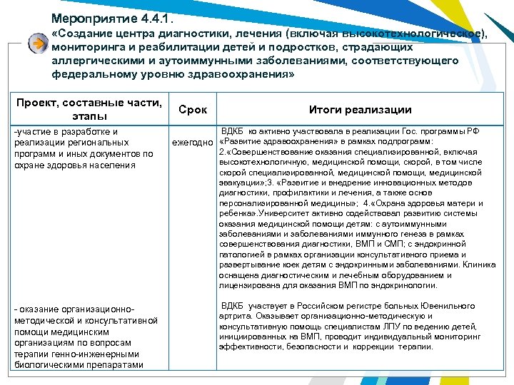 Мероприятие 4. 4. 1. «Создание центра диагностики, лечения (включая высокотехнологическое), мониторинга и реабилитации детей и подростков, страдающих аллергическими и аутоиммунными заболеваниями, соответствующего федеральному уровню здравоохранения» Проект, составные части, этапы -участие в разработке и реализации региональных программ и иных документов по охране здоровья населения - оказание организационнометодической и консультативной помощи медицинским организациям по вопросам терапии генно-инженерными биологическими препаратами Срок Итоги реализации ВДКБ ко активно участвовала в реализации Гос. программы РФ ежегодно «Развитие здравоохранения» в рамках подпрограмм: 2. «Совершенствование оказания специализированной, включая высокотехнологичную, медицинской помощи, скорой, в том числе скорой специализированной, медицинской помощи, медицинской эвакуации» ; 3. «Развитие и внедрение инновационных методов диагностики, профилактики и лечения, а также основ персонализированной медицины» ; 4. «Охрана здоровья матери и ребенка» . Университет активно содействовал развитию системы оказания медицинской помощи детям: с аутоиммунными заболеваниями иммунного генеза в рамках совершенствования диагностики, ВМП и СМП; с эндокринной патологией в рамках организации консультативного приема и развертывание коек детям с эндокринными заболеваниями. Клиника оснащена диагностическим и лечебным оборудованием и лицензирована для оказания ВМП по эндокринологии. ВДКБ участвует в Российском регистре больных Ювенильного артрита. Оказывает организационно-методическую и консультативную помощь специалистам ЛПУ по ведению детей, инициированных на ВМП, проводит индивидуальный мониторинг эффективности, безопасности и коррекции терапии.