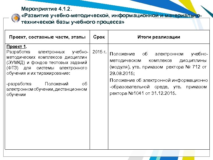 Мероприятие 4. 1. 2. «Развитие учебно-методической, информационной и материальнотехнической базы учебного процесса» Проект, составные части, этапы Срок Проект 1. Разработка электронных учебно- 2015 г. методических комплексов дисциплин (ЭУМКД) и фондов тестовых заданий (ФТЗ) для системы электронного обучения и их тиражирование: -разработка Положений об электронном обучении, дистанционном обучении Итоги реализации Положение об электронном учебнометодическом комплексе дисциплины (модуля), утв. приказом ректора № 712 от 29. 09. 2015; Положение об электронной информационно -образовательной среде, утв. приказом ректора № 1041 от 31. 12. 2015.
