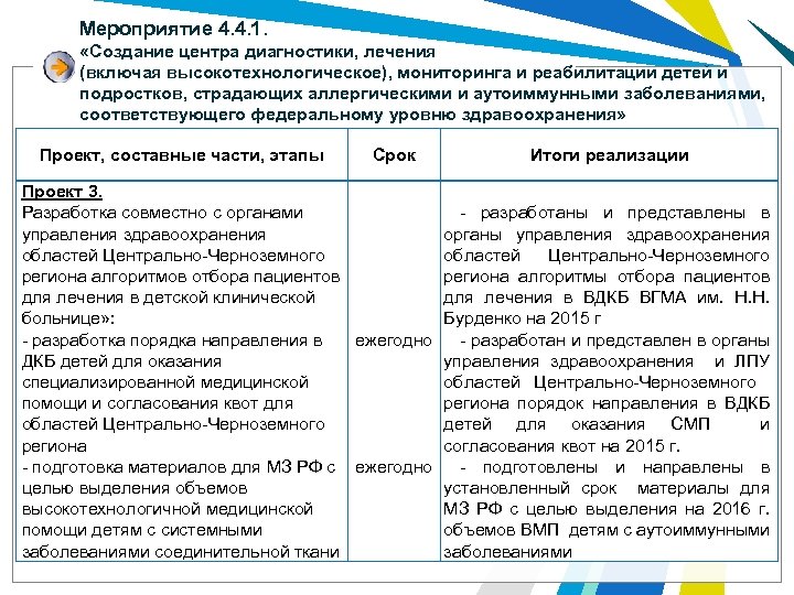 Мероприятие 4. 4. 1. «Создание центра диагностики, лечения (включая высокотехнологическое), мониторинга и реабилитации детей и подростков, страдающих аллергическими и аутоиммунными заболеваниями, соответствующего федеральному уровню здравоохранения» Проект, составные части, этапы Срок Итоги реализации Проект 3. Разработка совместно с органами - разработаны и представлены в управления здравоохранения органы управления здравоохранения областей Центрально-Черноземного региона алгоритмов отбора пациентов региона алгоритмы отбора пациентов для лечения в детской клинической для лечения в ВДКБ ВГМА им. Н. Н. больнице» : Бурденко на 2015 г - разработка порядка направления в ежегодно - разработан и представлен в органы ДКБ детей для оказания управления здравоохранения и ЛПУ специализированной медицинской областей Центрально-Черноземного помощи и согласования квот для региона порядок направления в ВДКБ областей Центрально-Черноземного детей для оказания СМП и региона согласования квот на 2015 г. - подготовка материалов для МЗ РФ с ежегодно - подготовлены и направлены в целью выделения объемов установленный срок материалы для высокотехнологичной медицинской МЗ РФ с целью выделения на 2016 г. помощи детям с системными объемов ВМП детям с аутоиммунными заболеваниями соединительной ткани заболеваниями
