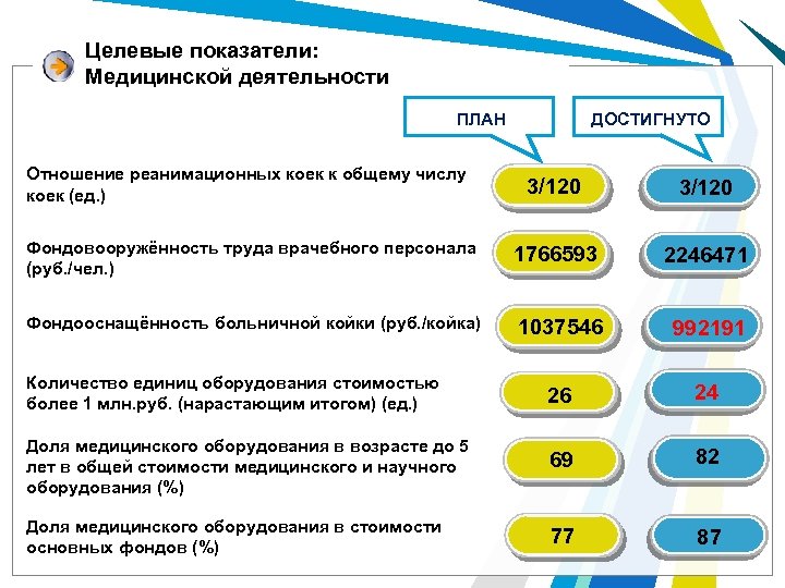 Целевые показатели: Медицинской деятельности ДОСТИГНУТО ПЛАН Отношение реанимационных коек к общему числу коек (ед. ) 3/120 Фондовооружённость труда врачебного персонала (руб. /чел. ) 1766593 2246471 Фондооснащённость больничной койки (руб. /койка) 1037546 992191 Количество единиц оборудования стоимостью более 1 млн. руб. (нарастающим итогом) (ед. ) 26 24 Доля медицинского оборудования в возрасте до 5 лет в общей стоимости медицинского и научного оборудования (%) 69 82 77 87 Доля медицинского оборудования в стоимости основных фондов (%)