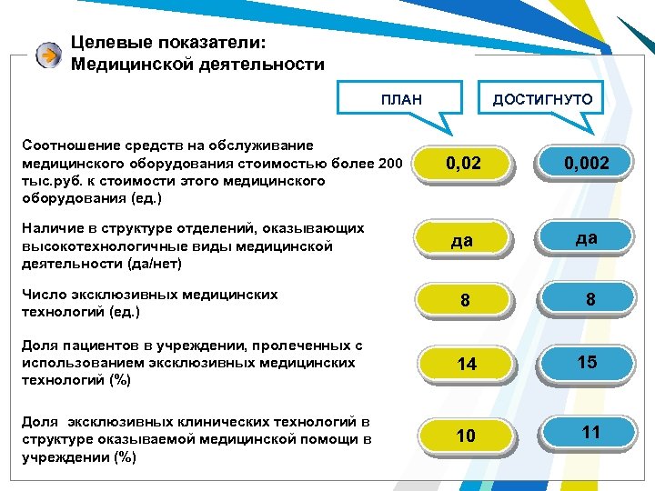 Целевые показатели: Медицинской деятельности ДОСТИГНУТО ПЛАН Соотношение средств на обслуживание медицинского оборудования стоимостью более 200 тыс. руб. к стоимости этого медицинского оборудования (ед. ) 0, 02 0, 002 да да 8 8 Доля пациентов в учреждении, пролеченных с использованием эксклюзивных медицинских технологий (%) 14 15 Доля эксклюзивных клинических технологий в структуре оказываемой медицинской помощи в учреждении (%) 10 11 Наличие в структуре отделений, оказывающих высокотехнологичные виды медицинской деятельности (да/нет) Число эксклюзивных медицинских технологий (ед. )