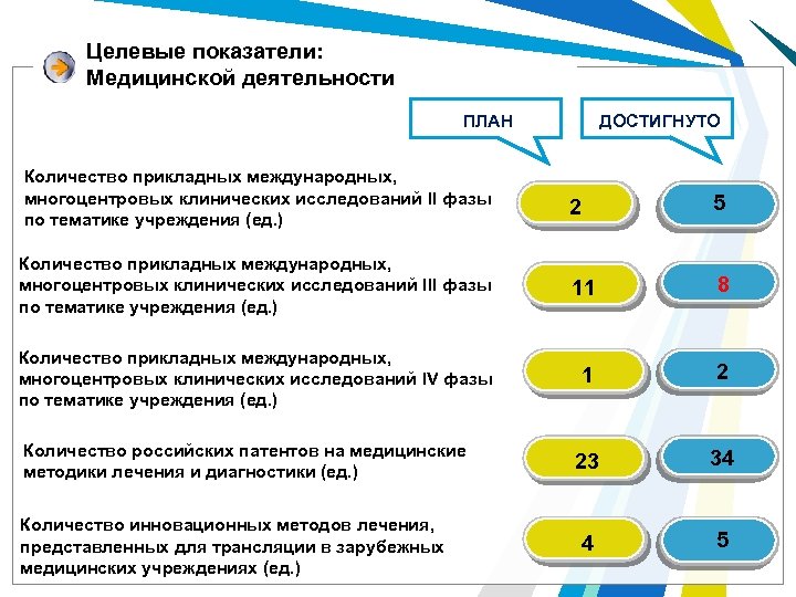 Целевые показатели: Медицинской деятельности ДОСТИГНУТО ПЛАН Количество прикладных международных, многоцентровых клинических исследований II фазы по тематике учреждения (ед. ) 2 5 Количество прикладных международных, многоцентровых клинических исследований III фазы по тематике учреждения (ед. ) 11 8 Количество прикладных международных, многоцентровых клинических исследований IV фазы по тематике учреждения (ед. ) 1 2 Количество российских патентов на медицинские методики лечения и диагностики (ед. ) 23 34 Количество инновационных методов лечения, представленных для трансляции в зарубежных медицинских учреждениях (ед. ) 4 5