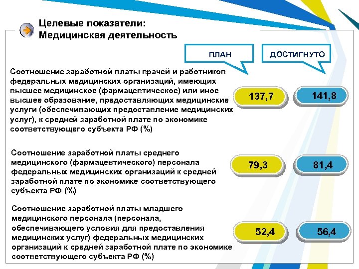 Целевые показатели: Медицинская деятельность ДОСТИГНУТО ПЛАН Соотношение заработной платы врачей и работников федеральных медицинских организаций, имеющих высшее медицинское (фармацевтическое) или иное высшее образование, предоставляющих медицинские услуги (обеспечивающих предоставление медицинских услуг), к средней заработной плате по экономике соответствующего субъекта РФ (%) Соотношение заработной платы среднего медицинского (фармацевтического) персонала федеральных медицинских организаций к средней заработной плате по экономике соответствующего субъекта РФ (%) Соотношение заработной платы младшего медицинского персонала (персонала, обеспечивающего условия для предоставления медицинских услуг) федеральных медицинских организаций к средней заработной плате по экономике соответствующего субъекта РФ (%) 137, 7 141, 8 79, 3 81, 4 52, 4 56, 4
