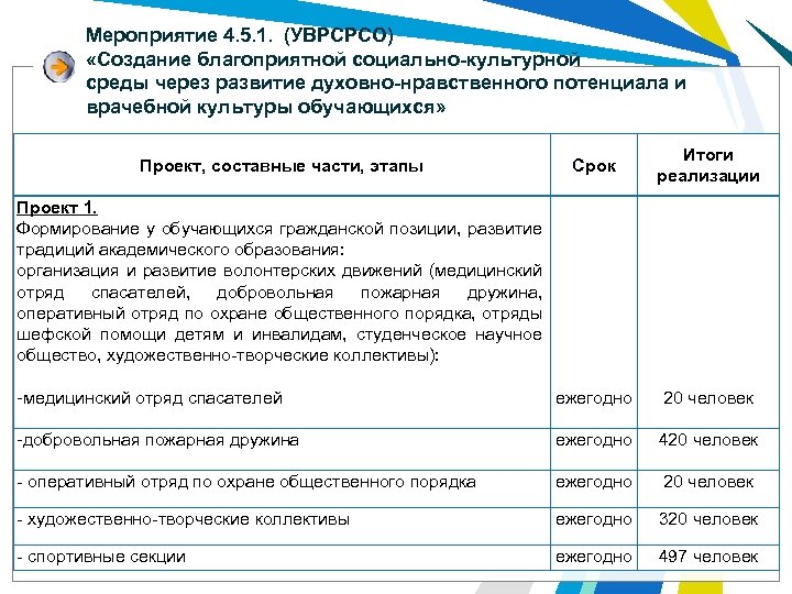 Мероприятие 4. 5. 1. (УВРСРСО) «Создание благоприятной социально-культурной среды через развитие духовно-нравственного потенциала и врачебной культуры обучающихся» Срок Итоги реализации -медицинский отряд спасателей ежегодно 20 человек -добровольная пожарная дружина ежегодно 420 человек - оперативный отряд по охране общественного порядка ежегодно 20 человек - художественно-творческие коллективы ежегодно 320 человек - спортивные секции ежегодно 497 человек Проект, составные части, этапы Проект 1. Формирование у обучающихся гражданской позиции, развитие традиций академического образования: организация и развитие волонтерских движений (медицинский отряд спасателей, добровольная пожарная дружина, оперативный отряд по охране общественного порядка, отряды шефской помощи детям и инвалидам, студенческое научное общество, художественно-творческие коллективы):