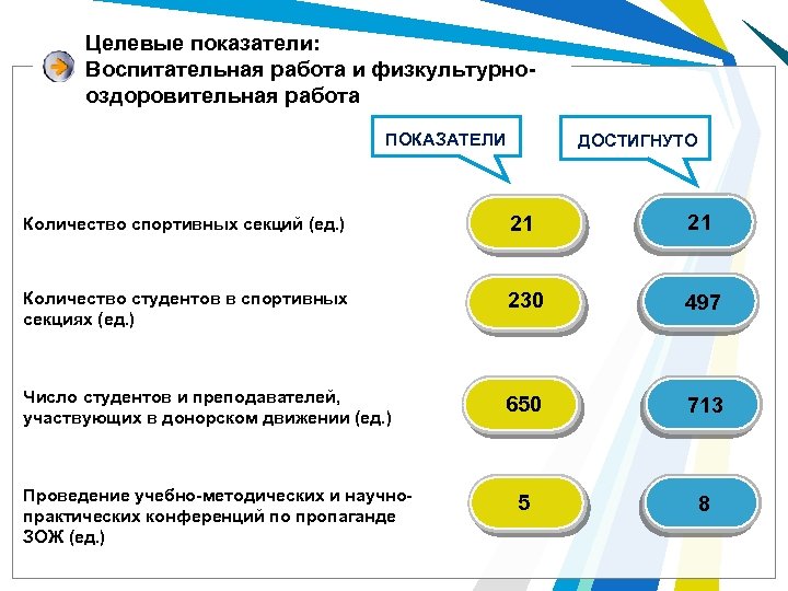 Целевые показатели: Воспитательная работа и физкультурнооздоровительная работа ПОКАЗАТЕЛИ ДОСТИГНУТО Количество спортивных секций (ед. ) 21 Количество студентов в спортивных секциях (ед. ) 230 497 650 713 Число студентов и преподавателей, участвующих в донорском движении (ед. ) Проведение учебно-методических и научнопрактических конференций по пропаганде ЗОЖ (ед. ) 5 8