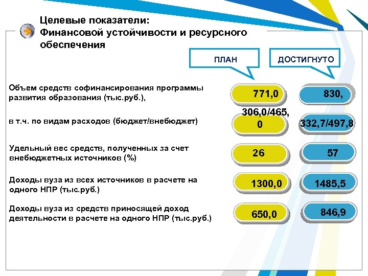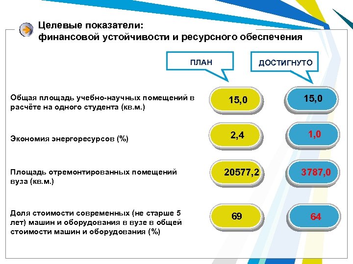 Целевые показатели: финансовой устойчивости и ресурсного обеспечения ПЛАН ДОСТИГНУТО Общая площадь учебно-научных помещений в расчёте на одного студента (кв. м. ) 15, 0 Экономия энергоресурсов (%) 2, 4 1, 0 Площадь отремонтированных помещений вуза (кв. м. ) Доля стоимости современных (не старше 5 лет) машин и оборудования в вузе в общей стоимости машин и оборудования (%) 20577, 2 69 3787, 0 64