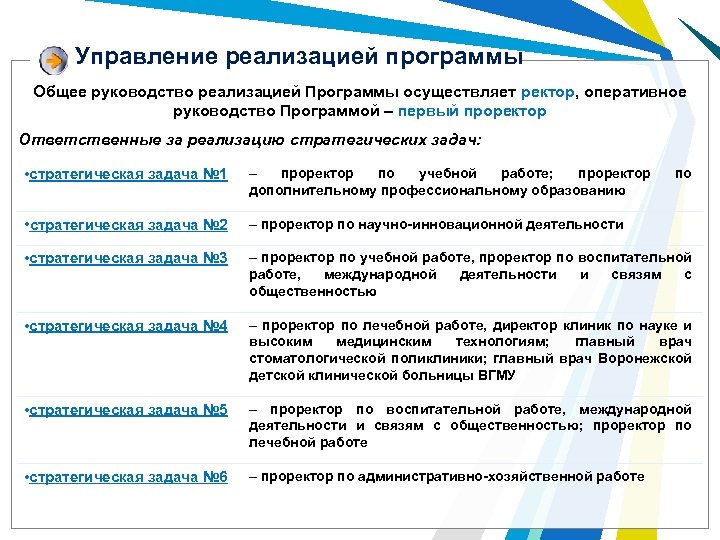 Управление реализацией программы Общее руководство реализацией Программы осуществляет ректор, оперативное руководство Программой – первый проректор Ответственные за реализацию стратегических задач: • стратегическая задача № 1 – проректор по учебной работе; проректор дополнительному профессиональному образованию по • стратегическая задача № 2 – проректор по научно-инновационной деятельности • стратегическая задача № 3 – проректор по учебной работе, проректор по воспитательной работе, международной деятельности и связям с общественностью • стратегическая задача № 4 – проректор по лечебной работе, директор клиник по науке и высоким медицинским технологиям; главный врач стоматологической поликлиники; главный врач Воронежской детской клинической больницы ВГМУ • стратегическая задача № 5 – проректор по воспитательной работе, международной деятельности и связям с общественностью; проректор по лечебной работе • стратегическая задача № 6 – проректор по административно-хозяйственной работе