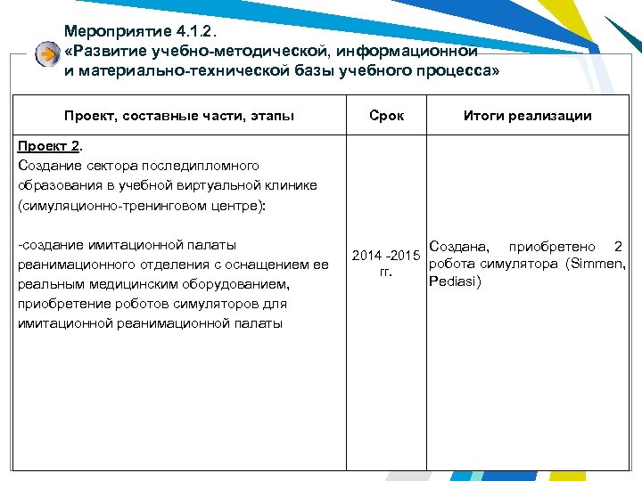Мероприятие 4. 1. 2. «Развитие учебно-методической, информационной и материально-технической базы учебного процесса» Проект, составные части, этапы Проект 2. Создание сектора последипломного образования в учебной виртуальной клинике (симуляционно-тренинговом центре): -создание имитационной палаты реанимационного отделения с оснащением ее реальным медицинским оборудованием, приобретение роботов симуляторов для имитационной реанимационной палаты Срок Итоги реализации Создана, приобретено 2 2014 -2015 робота симулятора (Simmen, гг. Pediasi)