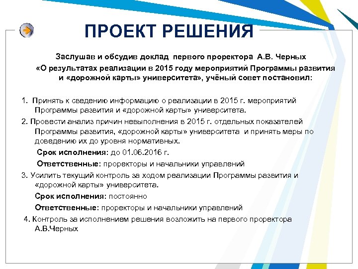 ПРОЕКТ РЕШЕНИЯ Заслушав и обсудив доклад первого проректора А. В. Черных «О результатах реализации в 2015 году мероприятий Программы развития и «дорожной карты» университета» , учёный совет постановил: 1. Принять к сведению информацию о реализации в 2015 г. мероприятий Программы развития и «дорожной карты» университета. 2. Провести анализ причин невыполнения в 2015 г. отдельных показателей Программы развития, «дорожной карты» университета и принять меры по доведению их до уровня нормативных. Срок исполнения: до 01. 06. 2016 г. Ответственные: проректоры и начальники управлений 3. Усилить текущий контроль за ходом реализации Программы развития и «дорожной карты» университета. Срок исполнения: постоянно Ответственные: проректоры и начальники управлений 4. Контроль за исполнением решения возложить на первого проректора А. В. Черных