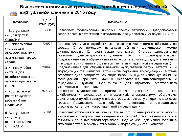 Высокотехнологичные тренажеры, приобретенные для Учебной виртуальной клиники в 2015 году Название 1. Виртуальный симулятор УЗИ Соно. СИМ 2. К плюс учебная система для отработки навыков аускультации звуков сердца Цена (тыс. руб) Назначение 3500 Позволяет моделировать широкий спектр патологии. Предполагается использовать в аттестации, аккредитации специалистов и их обучении УЗИ. 7205, 3 Предназначена для отработки всестороннего клинического обследования сердца. С ее помощью, используя обычный фонендоскоп, можно диагностировать 124 вида сердечного ритма. Система одновременно позволяет демонстрировать данные ЭКГ и фонокардиографии. Предназначена для обучения навыкам аускультации сердца, для аттестации и аккредитации специалистов (в том числе, для первичной аккредитации). Предназначена для обучения навыкам аускультации легких, аттестации и аккредитации специалистов (в том числе, первичной аккредитации). Система позволяет диагностировать 35 видов легочных шумов используя обычный фонендоскоп, при этом данные исследования синхронизированы с сердечными шумами. Предназначена для отработки всестороннего клинического обследования. Позволяет моделировать широкий спектр патологии, в том числе, диабетический кетоацидоз с гипоксемией, электротравму, обструкцию дыхательных путей, травму с пневмотораксом, закрытую черепно-мозговую травму. Предназначен для обучения, аттестации и аккредитации специалистов (в том числе, первичной аккредитации) 3. К плюс учебная система для отработки навыков аускультации звуков легких 2309, 3 4. Компьютерный робот-симулятор ребенка 6 лет Педиа. СИМ 6743, 1 5. Виртуальный симулятор офтальмоскопии Оптико. СИМ 2680 Позволяет отслеживать движения обучаемого, ориентировать их в нужном направлении, контролирует выведение на дисплей осматриваемого участка сетчатки с помощью симулятора глаза. Предназначен для использования в обучении офтальмоскопии аттестации и аккредитации специалистов.