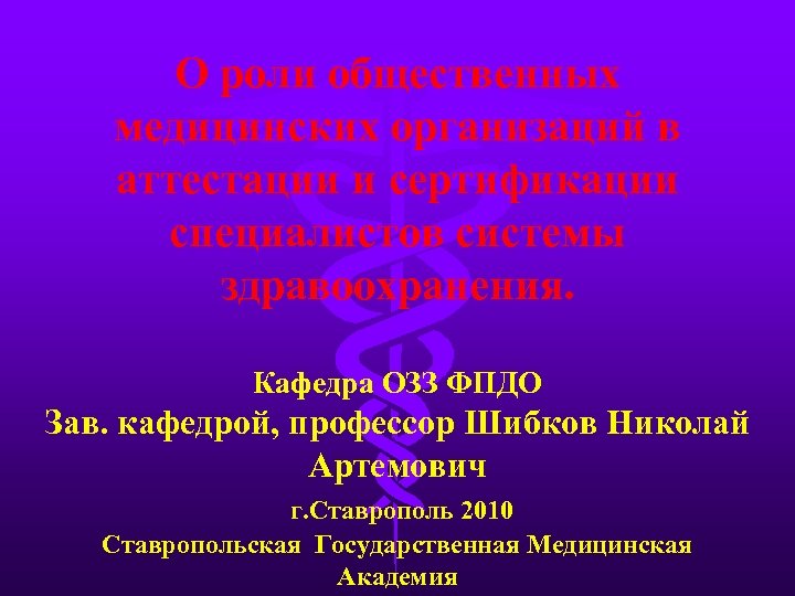 О роли общественных медицинских организаций в аттестации и сертификации специалистов системы здравоохранения. Кафедра ОЗЗ ФПДО Зав. кафедрой, профессор Шибков Николай Артемович г. Ставрополь 2010 Ставропольская Государственная Медицинская Академия