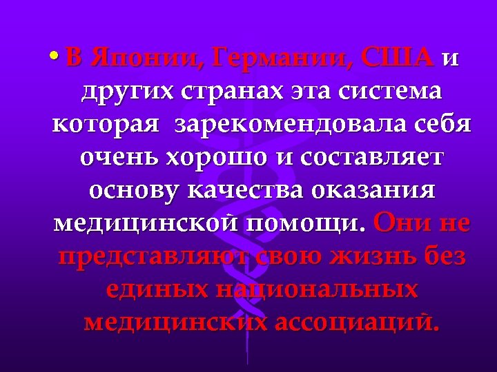 • В Японии, Германии, США и других странах эта система которая зарекомендовала себя очень хорошо и составляет основу качества оказания медицинской помощи. Они не представляют свою жизнь без единых национальных медицинских ассоциаций.