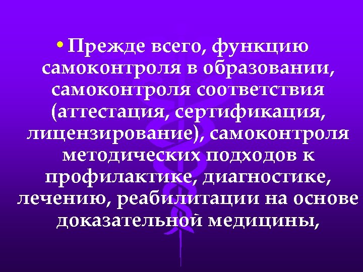 • Прежде всего, функцию самоконтроля в образовании, самоконтроля соответствия (аттестация, сертификация, лицензирование), самоконтроля методических подходов к профилактике, диагностике, лечению, реабилитации на основе доказательной медицины,