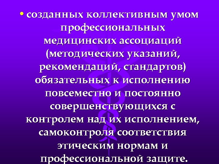 • созданных коллективным умом профессиональных медицинских ассоциаций (методических указаний, рекомендаций, стандартов) обязательных к исполнению повсеместно и постоянно совершенствующихся с контролем над их исполнением, самоконтроля соответствия этическим нормам и профессиональной защите.
