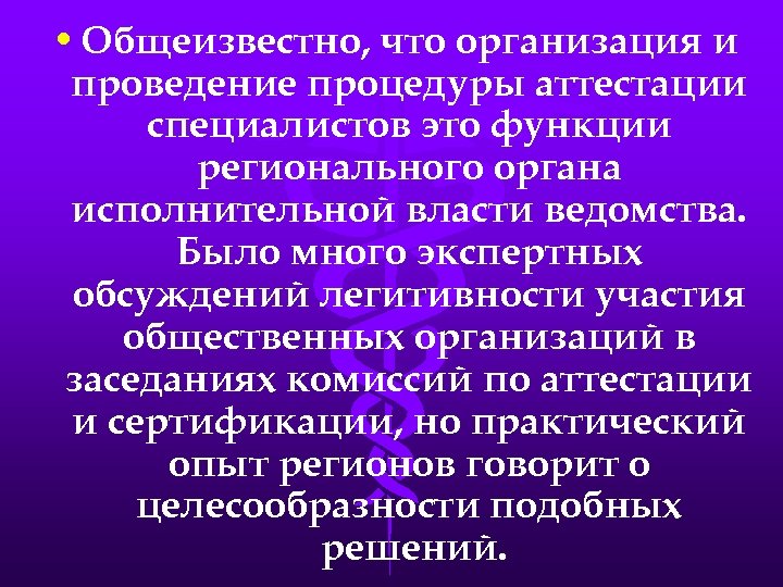 • Наряду с этим, высокая активность региональных врачебных и сестринских ассоциаций играет важную роль и в совершенствовании системы подготовки кадров. А аттестация и сертификация специалистов это одна из составляющих этого процесса.
