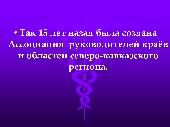 • Так 15 лет назад была создана Ассоциация руководителей краёв и областей северо-кавказского региона.