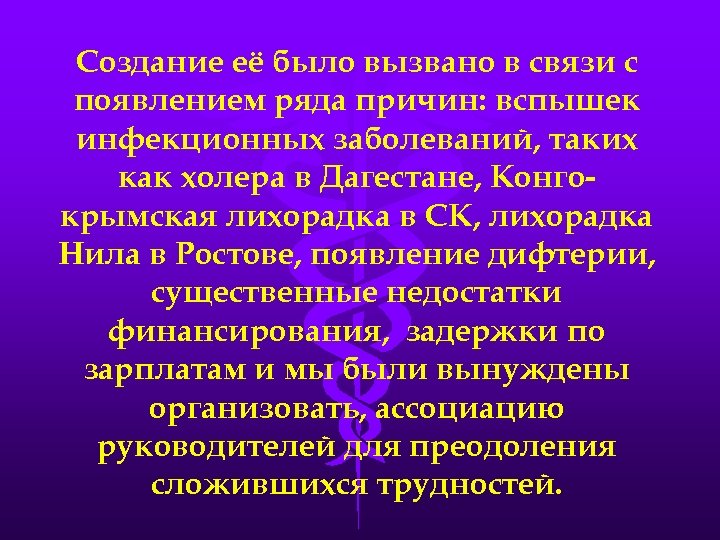 Создание её было вызвано в связи с появлением ряда причин: вспышек инфекционных заболеваний, таких как холера в Дагестане, Конгокрымская лихорадка в СК, лихорадка Нила в Ростове, появление дифтерии, существенные недостатки финансирования, задержки по зарплатам и мы были вынуждены организовать, ассоциацию руководителей для преодоления сложившихся трудностей.