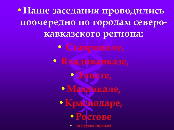 • Наше заседания проводились поочередно по городам северокавказского региона: • Ставрополе, • Владикавказе, • Элисте, • Махачкале, • Краснодаре, • Ростове • (и других городах)