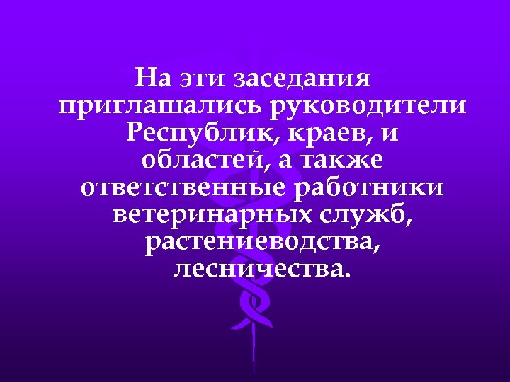 На эти заседания приглашались руководители Республик, краев, и областей, а также ответственные работники ветеринарных служб, растениеводства, лесничества.