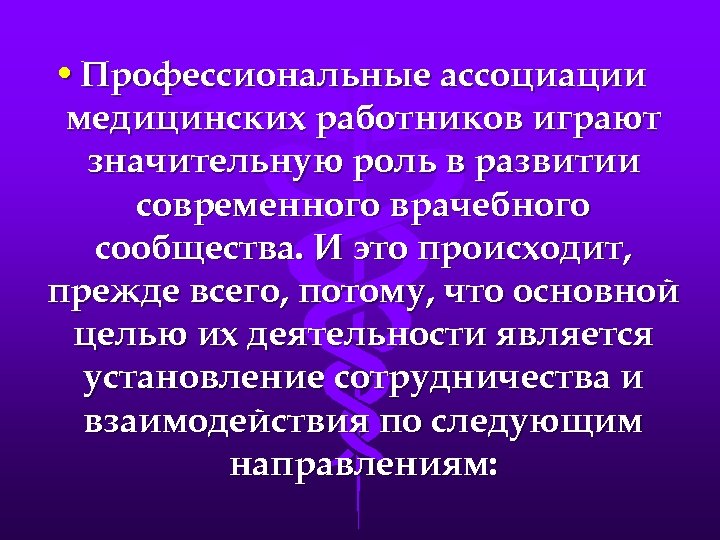 • Профессиональные ассоциации медицинских работников играют значительную роль в развитии современного врачебного сообщества. И это происходит, прежде всего, потому, что основной целью их деятельности является установление сотрудничества и взаимодействия по следующим направлениям:
