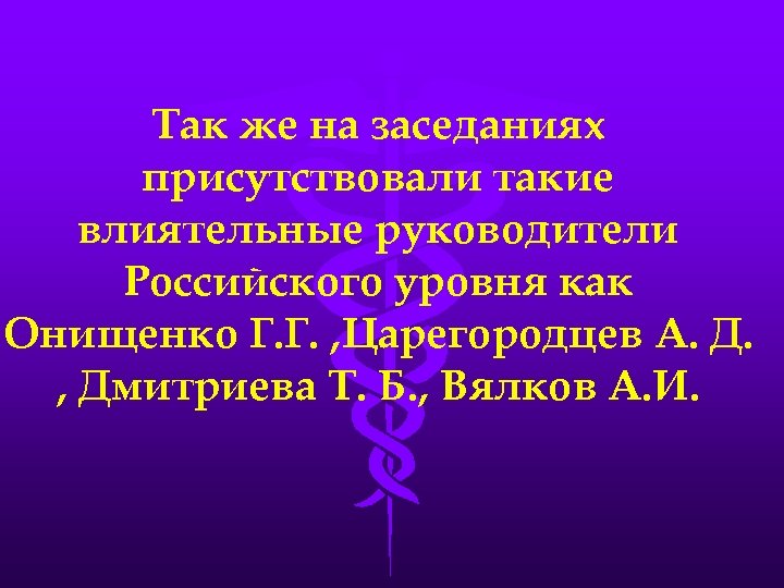 Так же на заседаниях присутствовали такие влиятельные руководители Российского уровня как Онищенко Г. Г. , Царегородцев А. Д. , Дмитриева Т. Б. , Вялков А. И.