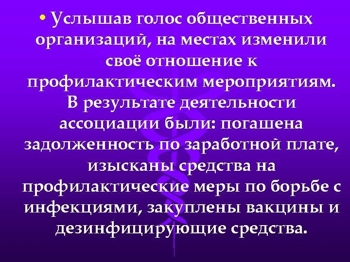 • Услышав голос общественных организаций, на местах изменили своё отношение к профилактическим мероприятиям. В результате деятельности ассоциации были: погашена задолженность по заработной плате, изысканы средства на профилактические меры по борьбе с инфекциями, закуплены вакцины и дезинфицирующие средства.