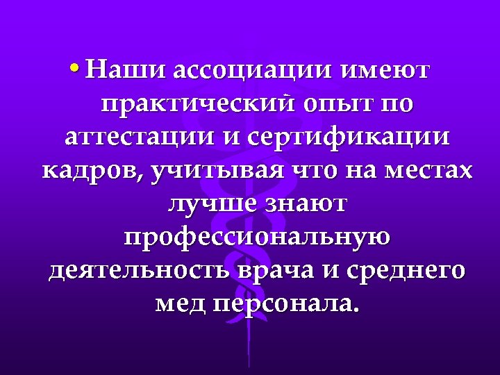 • Наши ассоциации имеют практический опыт по аттестации и сертификации кадров, учитывая что на местах лучше знают профессиональную деятельность врача и среднего мед персонала.