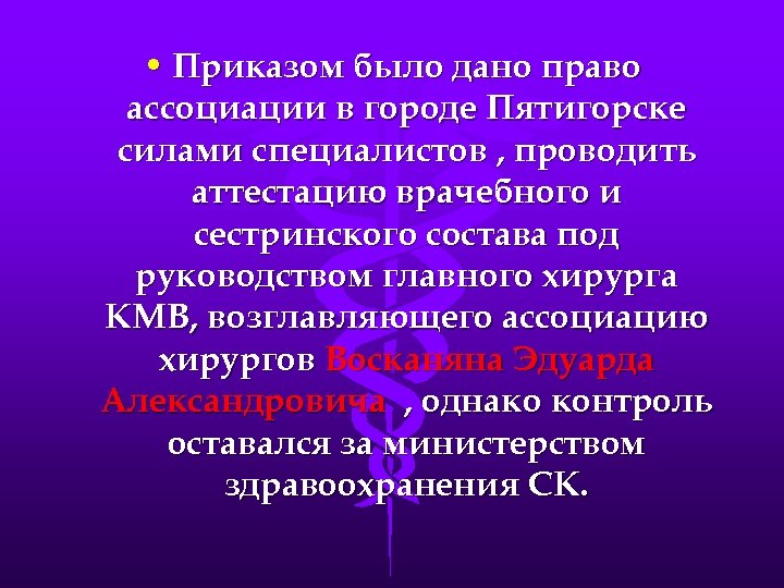 • Приказом было дано право ассоциации в городе Пятигорске силами специалистов , проводить аттестацию врачебного и сестринского состава под руководством главного хирурга КМВ, возглавляющего ассоциацию хирургов Восканяна Эдуарда Александровича , однако контроль оставался за министерством здравоохранения СК.