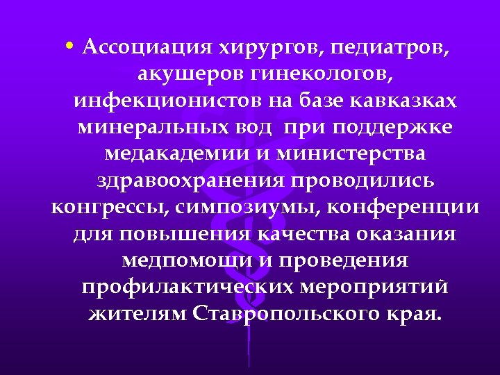 • Ассоциация хирургов, педиатров, акушеров гинекологов, инфекционистов на базе кавказках минеральных вод при поддержке медакадемии и министерства здравоохранения проводились конгрессы, симпозиумы, конференции для повышения качества оказания медпомощи и проведения профилактических мероприятий жителям Ставропольского края.