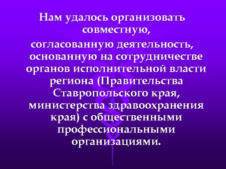 Нам удалось организовать совместную, согласованную деятельность, основанную на сотрудничестве органов исполнительной власти региона (Правительства Ставропольского края, министерства здравоохранения края) с общественными профессиональными организациями.