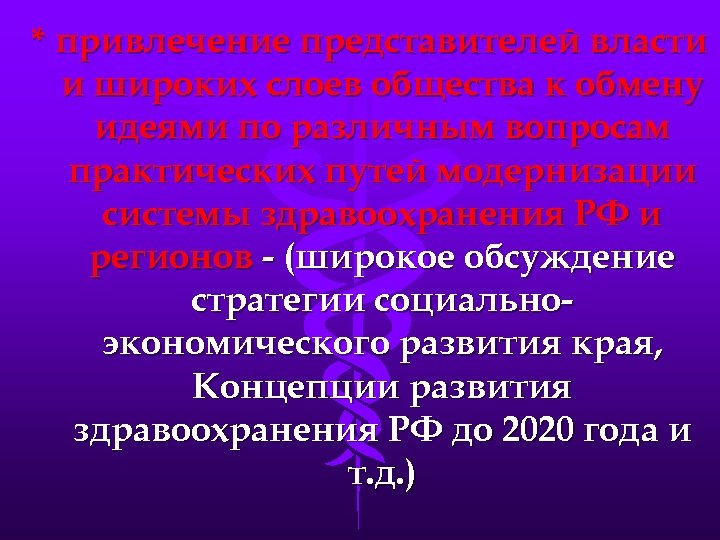 * привлечение представителей власти и широких слоев общества к обмену идеями по различным вопросам практических путей модернизации системы здравоохранения РФ и регионов - (широкое обсуждение стратегии социальноэкономического развития края, Концепции развития здравоохранения РФ до 2020 года и т. д. )